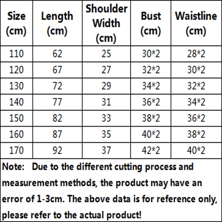 Note: Measurements may have 1-3 cm error due to different cutting and measuring methods.