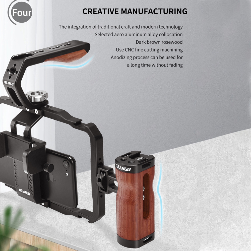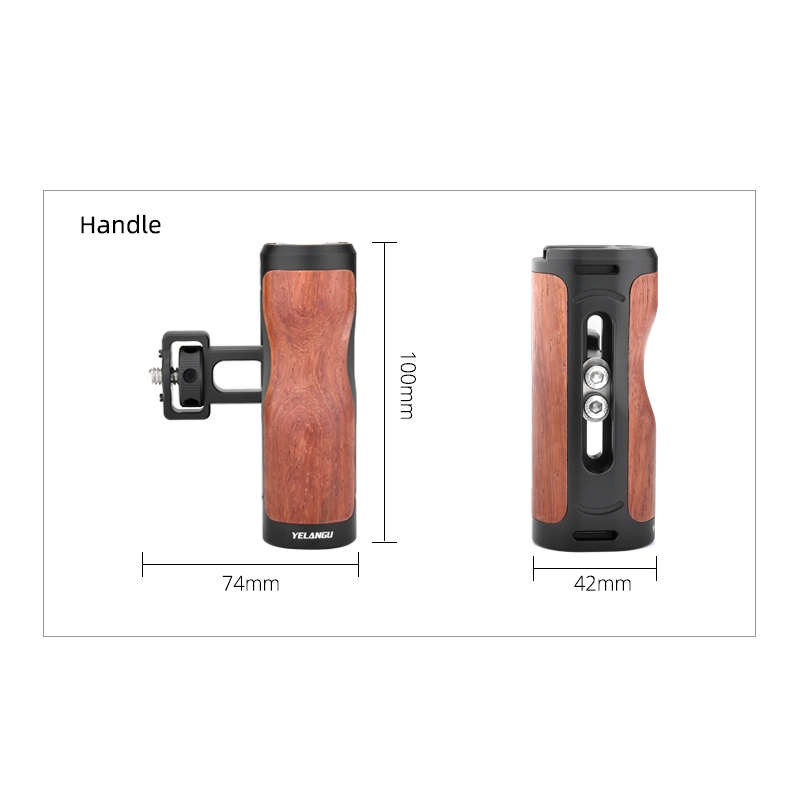 5. The appearance of the side handle and the upper handle is made of aluminum alloy and wood, which is not only comfortable to hold, but also non-slip; the hidden design of the M4 hexagonal wrench is simple and convenient to store; the upper design has a cold shoe mouth and multiple 1/4 screw holes, Expansion accessories are easy to install